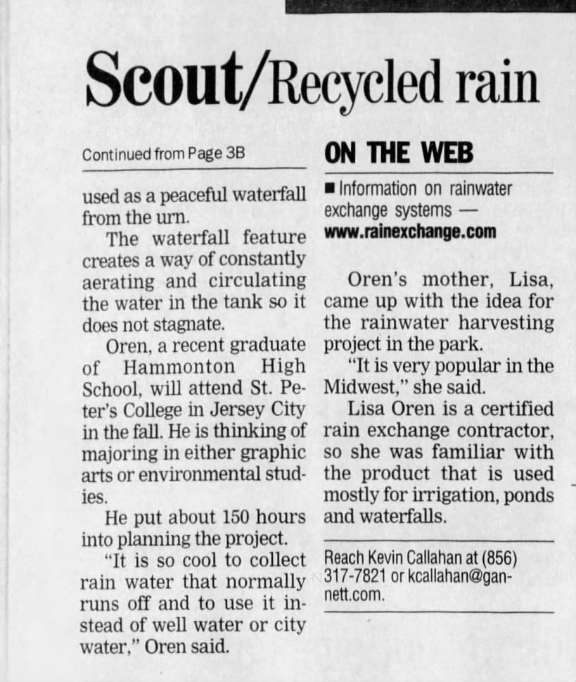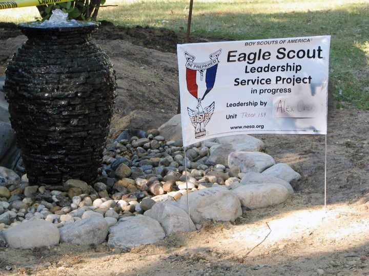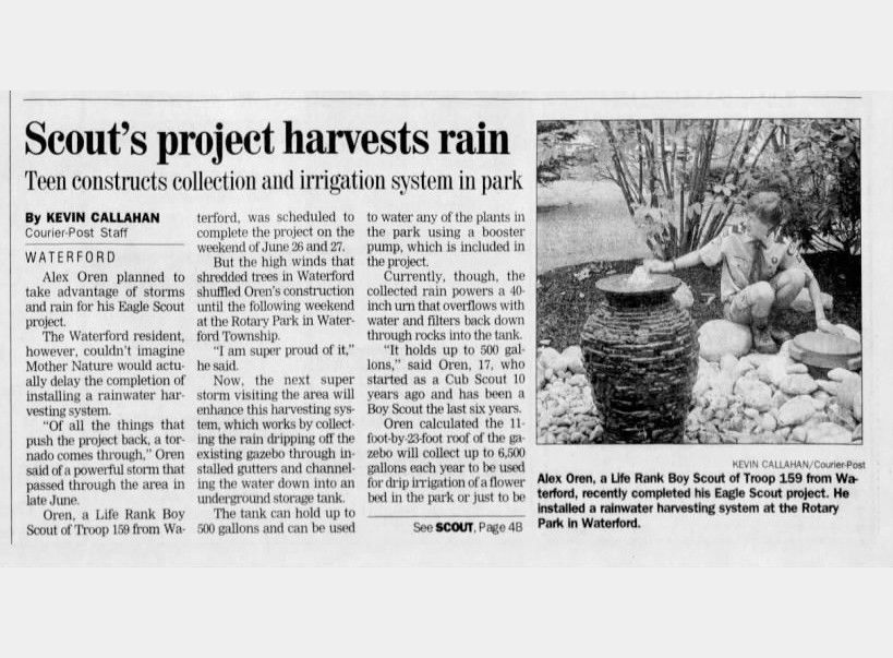 Back in 2010, Alex utilized this system for his Eagle Scout project with the Rotary Club, where he constructed a rainwater harvesting system in a local park. This included installing gutters on the existing gazebo that directed water into a 500-gallon reservoir, and a stacked-slate urn fountain that would recirculate the water. The entire system was connected to a booster pump that would also enable them to utilize the stored rainwater for watering the plants in the park.